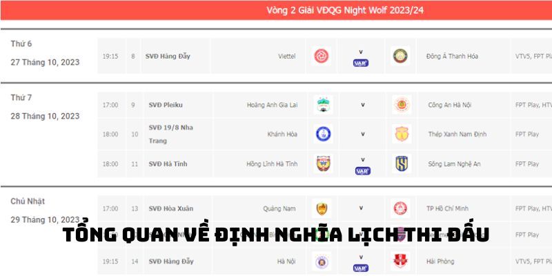 Lịch thi đấu luôn là nguồn thông tin quan trọng được nhiều người quan tâm, đặc biệt khi các giải đấu lớn diễn ra. Việc biết được thời gian chính xác của các trận đấu giúp bạn sắp xếp kế hoạch cá nhân một cách hoàn hảo hơn. Trong bài viết dưới đây, Vebo TV sẽ giúp bạn có cái nhìn tổng quan hơn về thuật ngữ này.